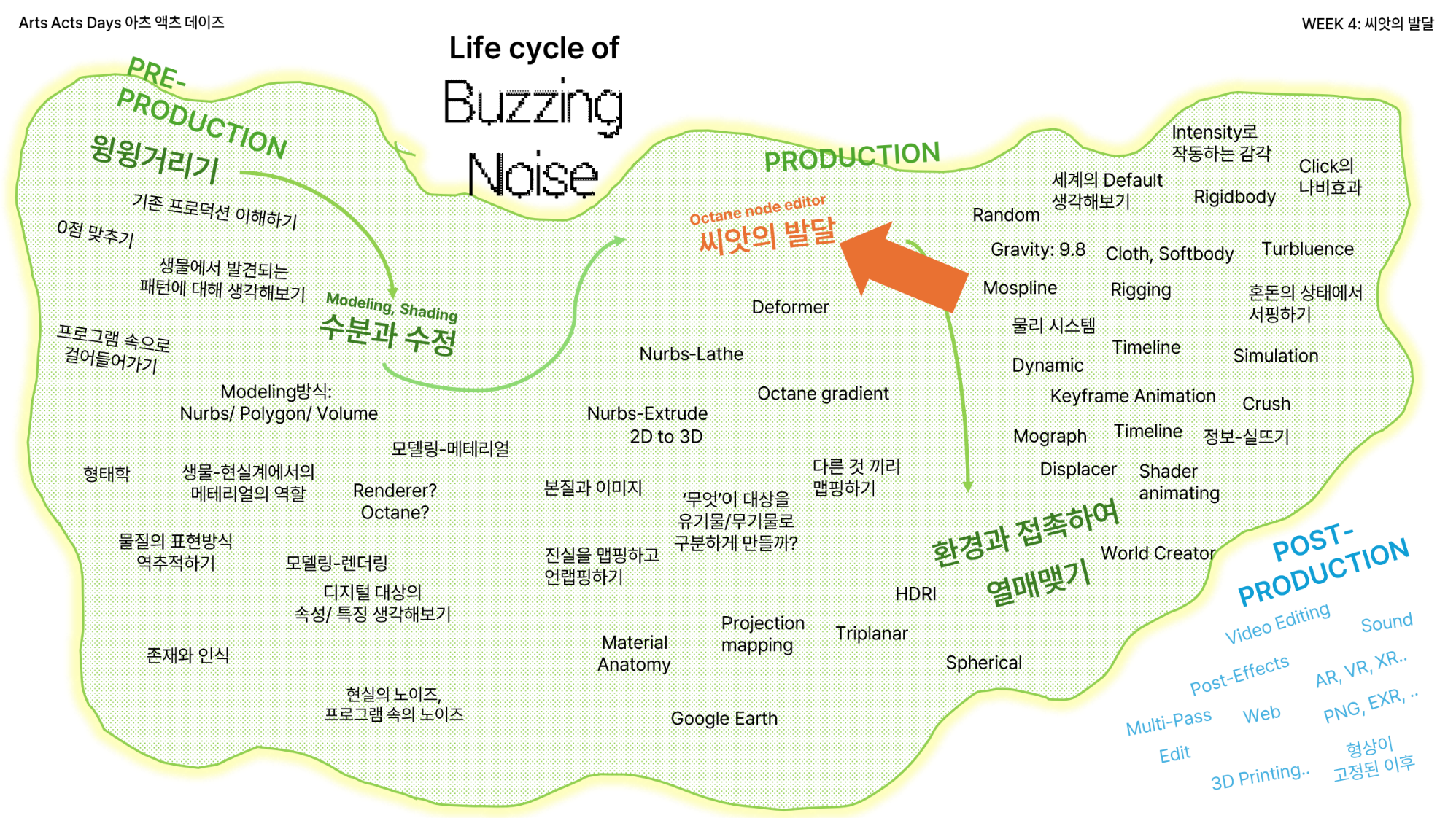 〈버징 노이즈〉는 우리가 발 딛고 살고 있는 물질 세계가 아닌 화면 속 3D 환경 속 대상에 더 집중해 보는 워크숍이었습니다. 하지만 역설적이게도, 참여자들은 워크숍을 통해 물질 세계를 더 세밀하게 관찰해 보게 되었다고 평합니다. 3D 환경 속에서 특정 대상을 재현하기 위해서는 그것을 세밀하게 관찰해야 하는 것이 선행되어야 하기 때문입니다. 노이즈를 다루는 일은 결국 사물의 표면과 구조를 해석하는 일과 맞닿아 있었고, 이에 디지털 환경 속에서의 창작은 주변의 환경과 조건을 면밀하게 탐색해 보는 계기가 되었습니다.