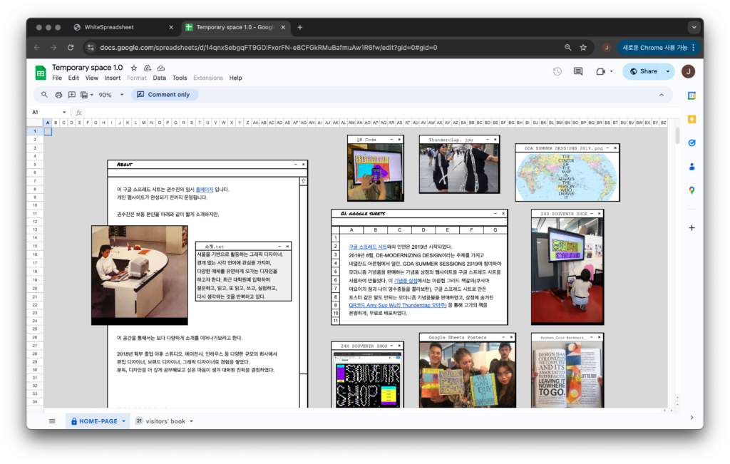 두 번째 호스트, 권수진의 스프레드시트와 인터넷 산책하기 실라버스는 함께 인터넷을 산책하며 온라인 공간을 살펴보고, 많은 자본과 기술 없이 가볍고 사적인 아이디어를 채집하고 분류하여 스프레드시트로 시적인 웹사이트를 출판하도록 안내했습니다. 워크숍에서는 가연, 보라, 미예, 주영, 은지, 슬아, 연지 님과 함께 인터넷을 산책하며, 스프레드시트로 웹사이트를 출판했습니다.