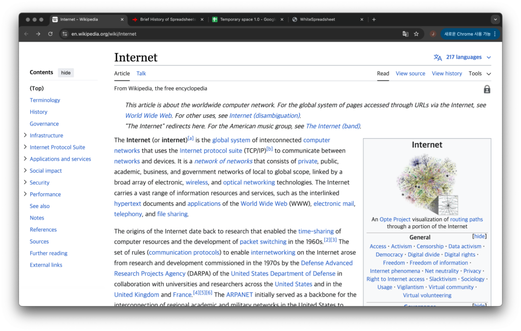 다른 말로는 네트워크와 장치 사이의 ‘통신’을 목적으로 상호 연결된 ‘글로벌 컴퓨터 네트워크 시스템’이라고 설명할 수 있습니다.