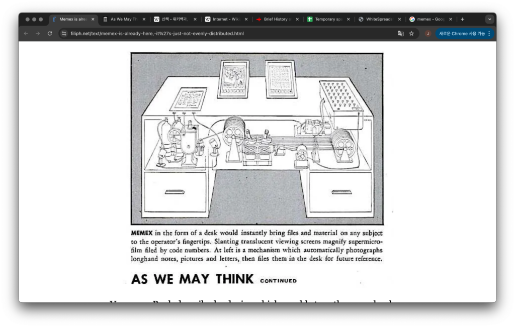 본 논문에서 부시는 ‘과도하게 많은 정보가 존재하게 되면, 연구자들이 최신의 연구에만 집착하게 될 것’이라 주장했으며, 이를 해결하기 위해 ‘정보 조직화’에 관한 가설적 장치를 제안합니다