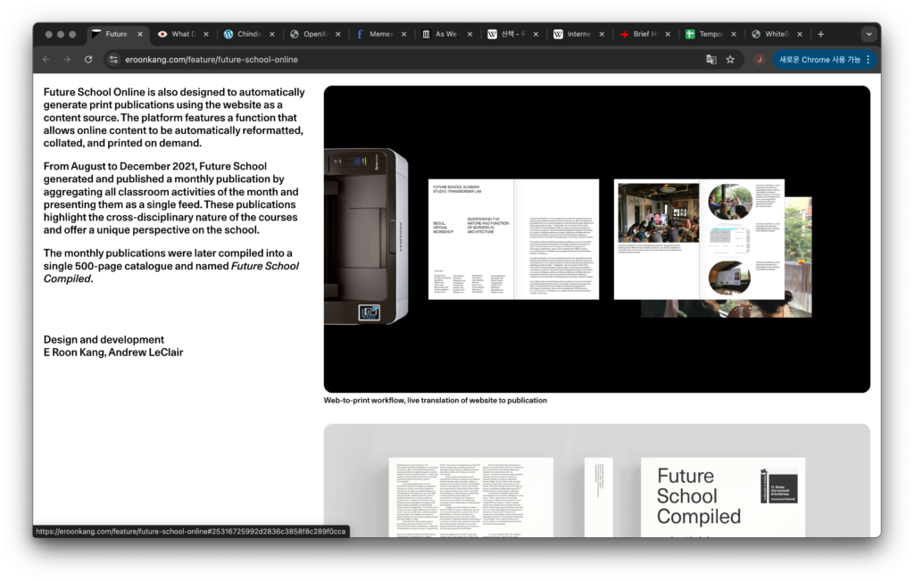 웹사이트를 설계한 강이룬 디자이너는 웹사이트는 게시된 내용을 콘텐츠 소스로 활용하여 인쇄 출판물을 자동 생성하는 기능을 직접 설계했습니다. 이를 통해 웹사이트는 손쉬운 출판 도구가 되어 방문자는 온라인 콘텐츠를 자동으로 형식화하고, 대조하고, 인쇄할 수 있습니다.