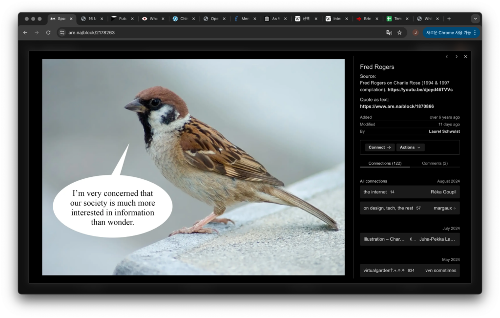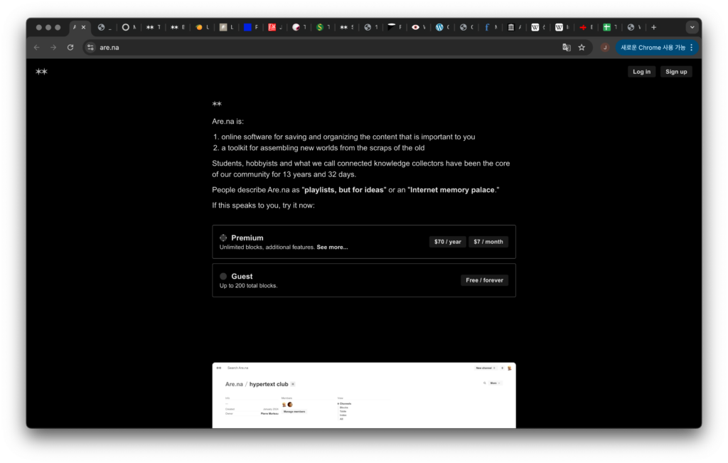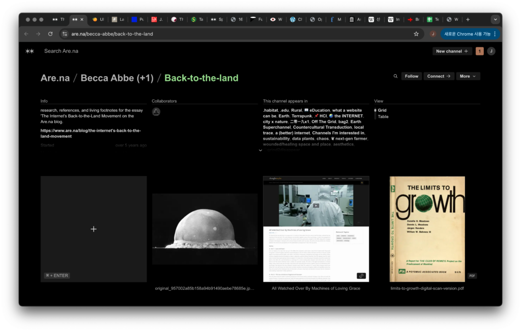 Are.na는 개인 또는 다른 사람과 함께 콘텐츠를 저장하고, 컬렉션을 만들고, 아이디어를 연결하여 새로운 형태의 지식을 형성하는 장소입니다.