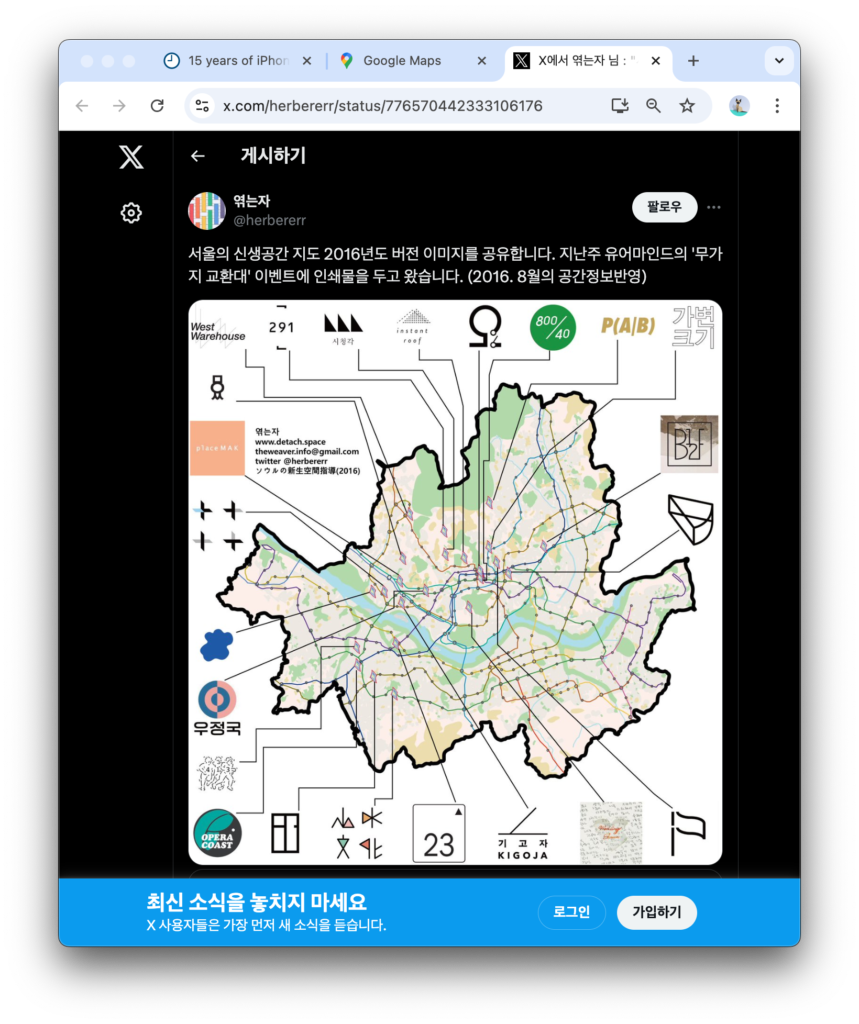 스마트폰을 손에 쥐게 되면서 우리는 개인을 둘러싸고 있는 공간적 제약을 발견할 수 있었습니다. 2000년대 초 서울이라는 시공간으로 좁혀 이야기하자면, 서울 사대문 안 바깥은 미술을 전시하기도, 찾아보기도 어려웠습니다. 그러나 스마트폰의 내비게이션은 지도를 이용해 바깥으로 사람을 이동시키고 불러모으는 그림을 우리의 머릿속에 떠올릴 수 있게 만들었습니다. 작업과 전시를 선보일 공간을 고려할 때, 바깥의 공간을 상상할 수 있게 된 것입니다.