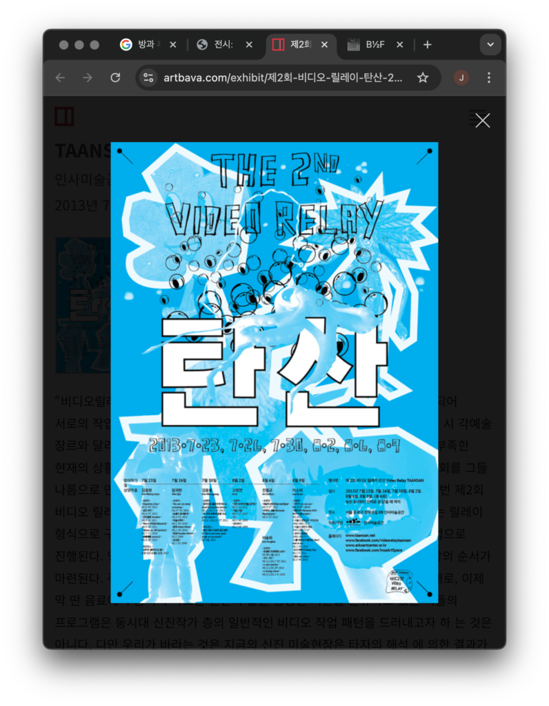 《비디오 릴레이 탄산》의 경우, 장소 상관 없이 상영 작가가 다음 작가를 추천하며 비디오를 릴레이로 상영했습니다. 영상은 어디서든 상영할 수 있었고, SNS에 공지를 하면 사람들이 찾아올 수 있었습니다.