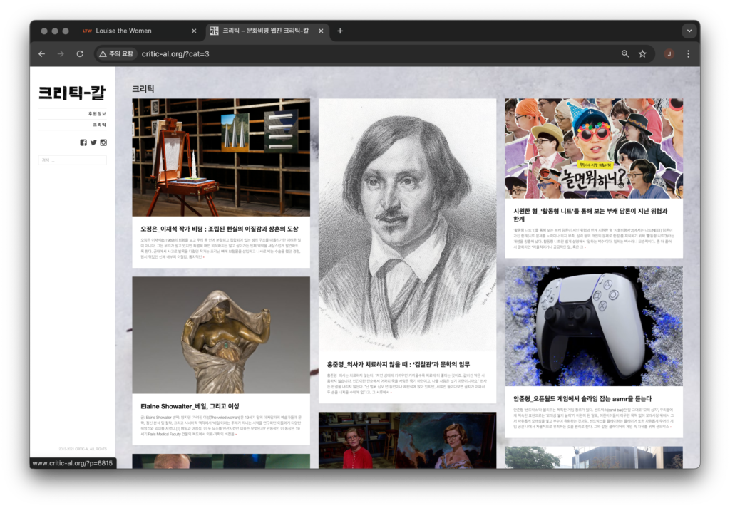 예를 들어 크리틱-칼의 경우, 미술 잡지와 언론에서 소화하지 못하는 글을 기고할 수 있습니다. 비평글을 읽은 사람들이 전시를 보러 가고 다시 이야기하는 문화가 활성화되기도 했습니다.