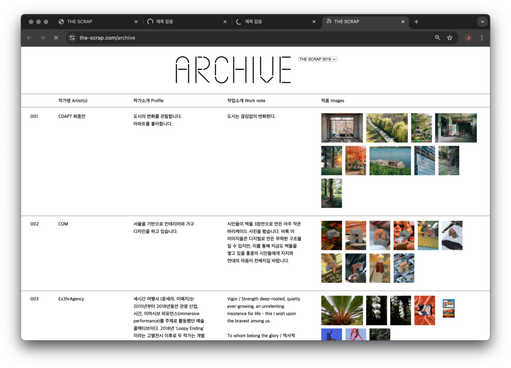 《더스크랩》의 경우, 동일한 인화방식과 크기로 프린트한 사진 작업 1,000여 점을 쇼룸 형태의 전시장에서 전시, 판매, 유통한 행사였습니다.