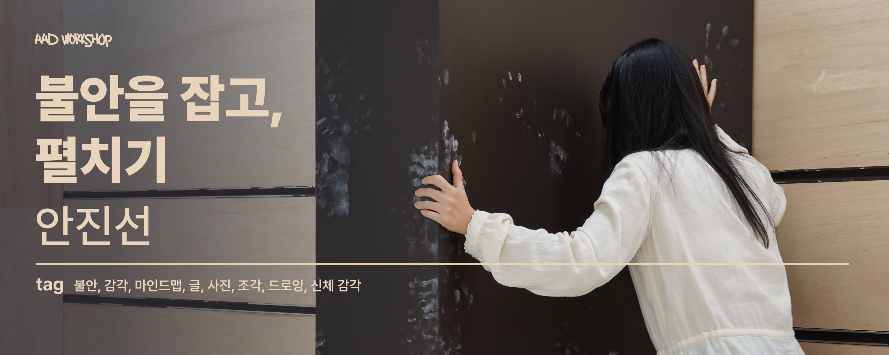 워크숍은 [관찰 – 조형 실험 – 공유]의 흐름으로 진행됩니다. 마인드맵, 사진, 글, 작은 조각, 설치 등 다양한 매체를 활용하는 작가의 작업 방식을 따라가는 과정에서 우리는 불안을 만지고, 어쩌면 가지고 놀아볼 수도 있습니다. 이때 우리의 행위는 불안을 통제하거나 억누르는 것이 아닌 그것을 유연하게 다루고 탐색하는 태도가 될 것입니다.