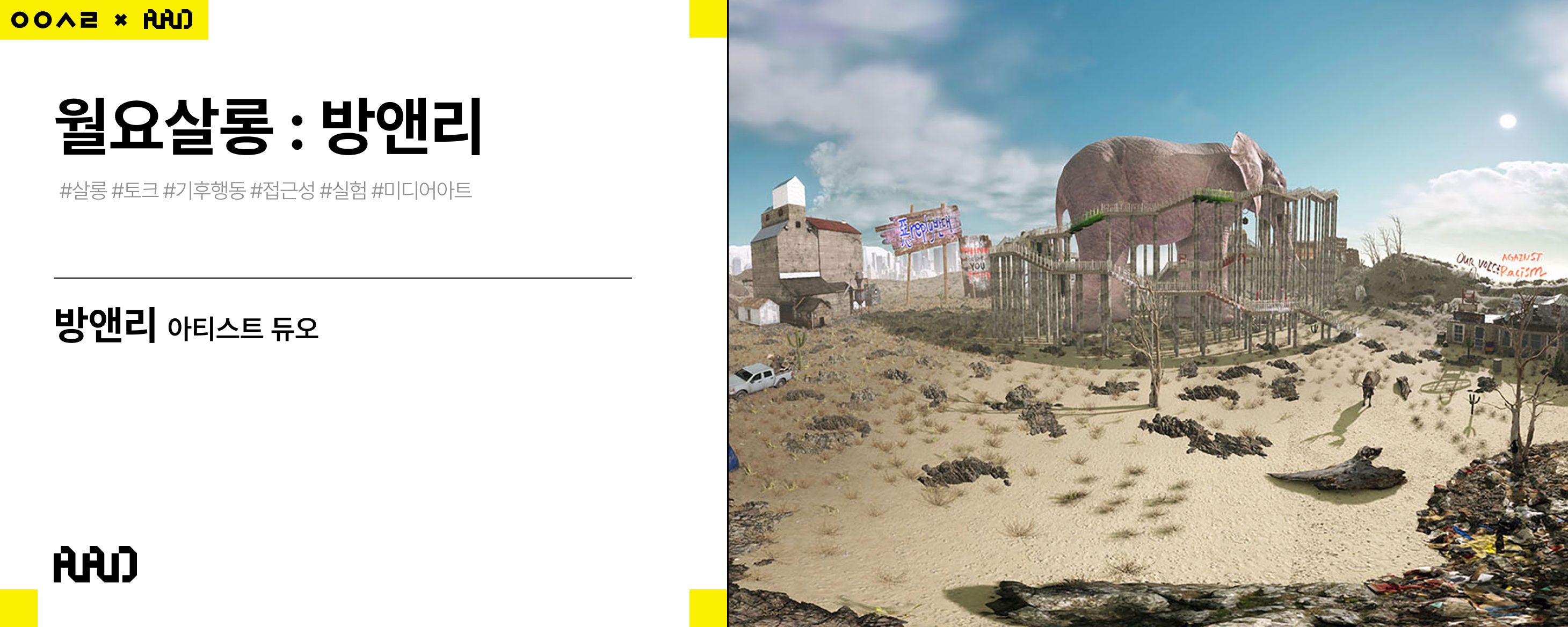 아티스트 듀오 방앤리와 함께 기후행동 관련 프로젝트 기록 영상(필름), 멀티채널 3D 애니메이션(영상 설치 연작)을 감상하며 자유롭게 이야기 나누는 시간을 함께합니다. 스크리닝 사이에는 시낭독도 함께 진행됩니다.