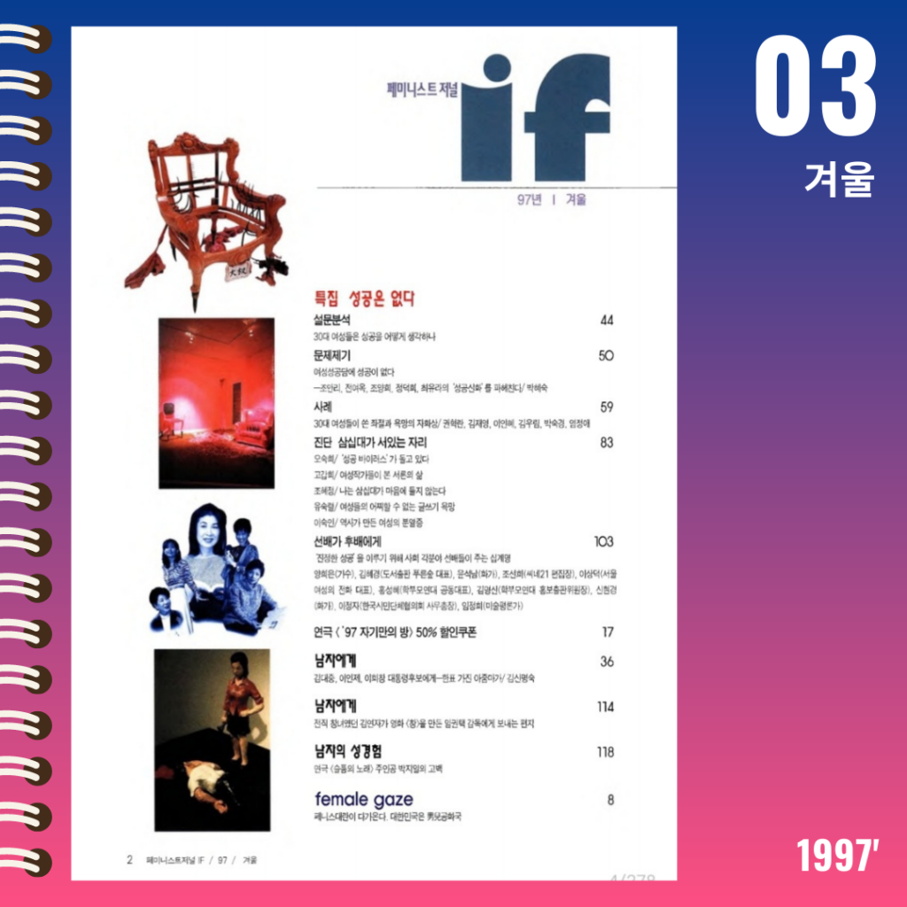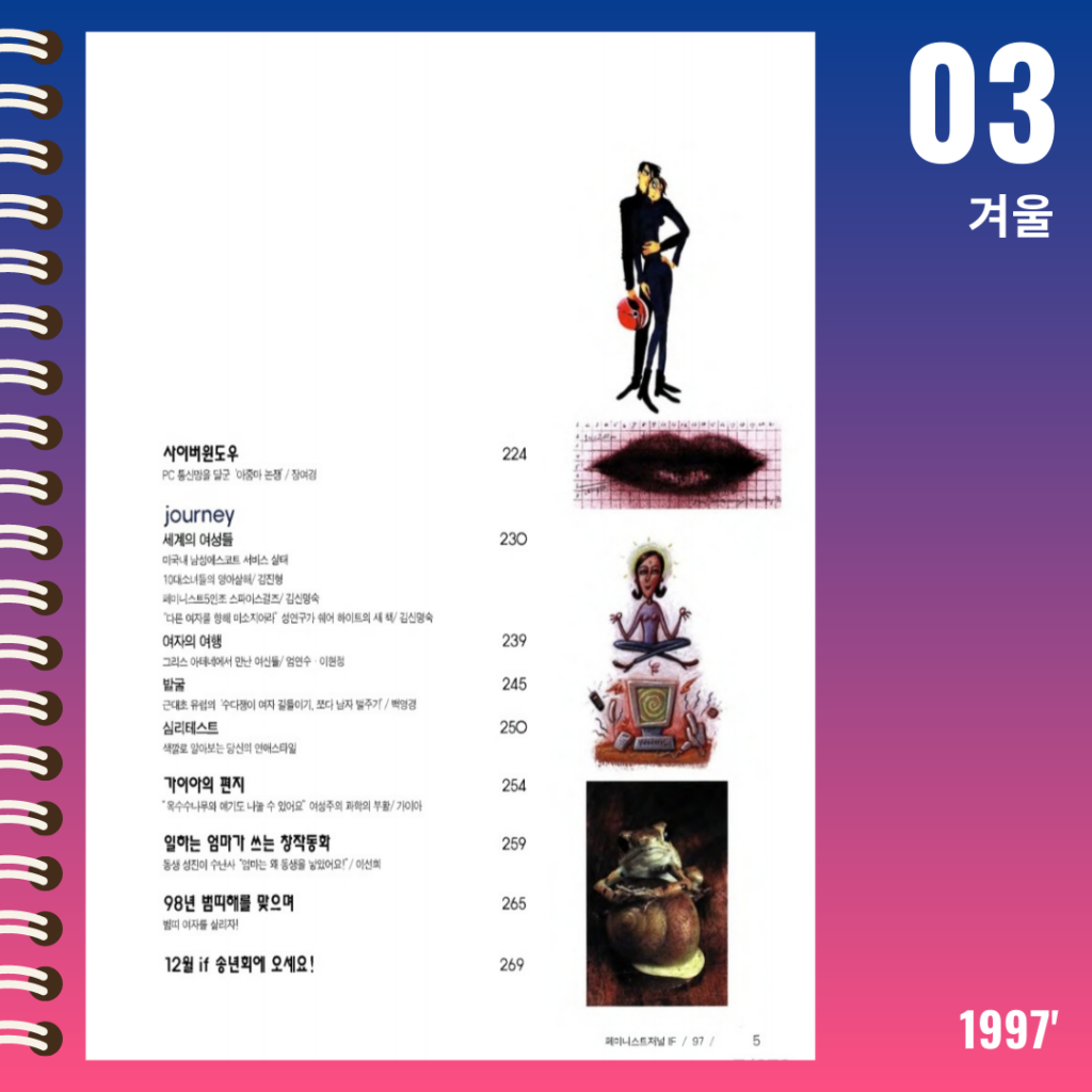 *if이프열람 : 97년 겨울호는 인터넷 검색창에 문화미래 이프 www.ifbooks.co.kr 에서 회원가입-로그인 후 pdf 다운로드 및 열람이 가능하며, 세검정 공간 일리 부엌에도 비치되어 있습니다.