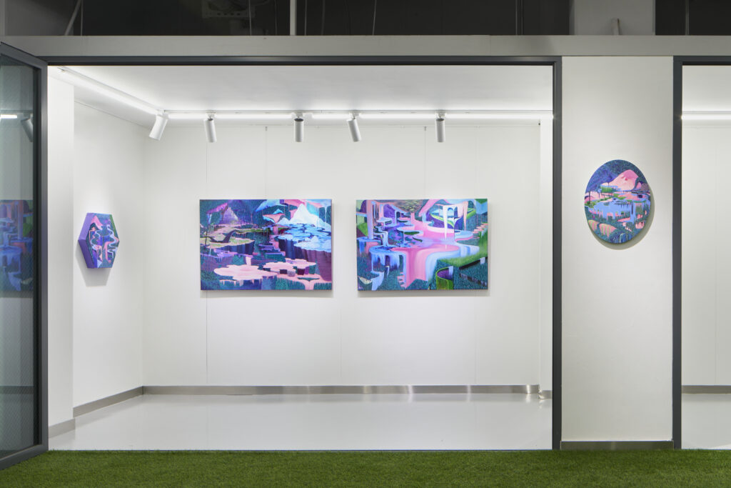김지희 작가는 상상의 풍경을 그립니다. 그는 그곳을 “물리적으로 있음직한 공간과 심리적 공간 사이 어딘가”의 공간이라고 부릅니다. 있음직하지만 모호한 그곳을 표현하고자 작가는 캔버스와 그 바깥인 실제의 공간을 넘나듭니다. 회화의 캔버스는 그림의 바탕이자 배경을 이룹니다. 네모난 캔버스는 그 내부에 그려진 세계가 단일한 하나의 세계라는 전제이자 약속을 구성합니다. 그러나 작가가 넘어서고자 하는 것은 캔버스가 하나의 세계를 이룬다는 바로 그 정언입니다. 초기작에서 비롯해 오랜 공백 이후 선보이는 근작의 공통된 특징이 화면의 제한을 넘어서 다층의 공간을 넘나드는 세계를 창조하는 것입니다. 그의 화폭 속에서 세계는 분할되고 구성되는 한편, 주어진 면과 구획을 넘나들며 옆에 걸린 또 다른 화폭으로, 나아가 벽면으로 확장됩니다.
