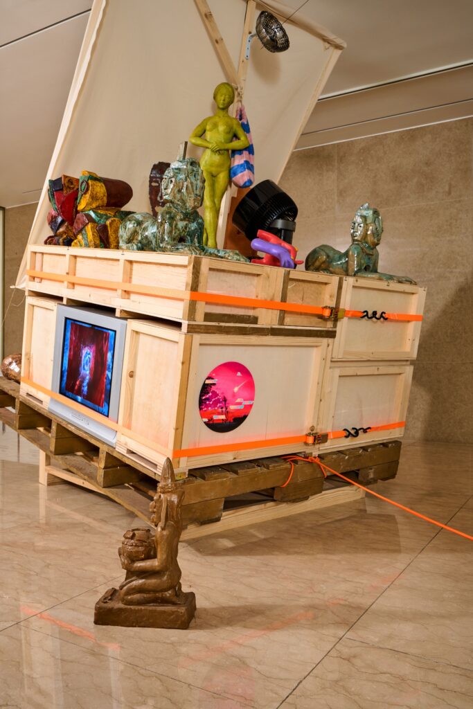 오제성_조각가의시간항해술,나무,아날로그TV, 천,석고나무, 돌, 세라믹,합성수지, P.LA,철,가변설치,2023