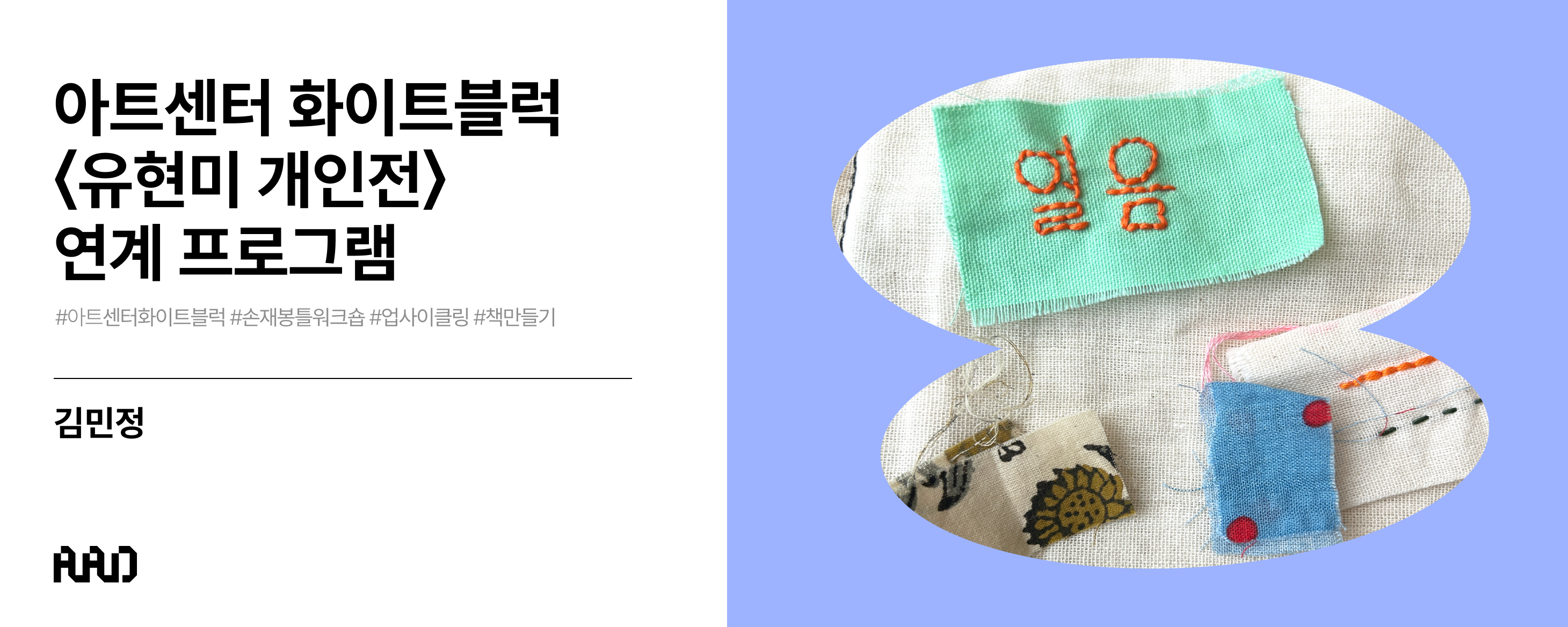 <비비디 바비디 북>은 아트센터 화이트블럭에서 열리는 유현미 개인전 연계 성인교육 프로그램입니다. 전시를 관람한 후 자신의 자아를 찾아가는 2024년 사계절 일기를 구상하고, 쓰임을 다한 천을 재료로 손재봉틀을 이용하여 업사이클링 책을 만들어 봅니다. 프로그램을 통해 내면의 소리에 귀 기울이고 사물의 다양한 쓰임에 대해 고민하는 시간이 되기를 기대합니다.