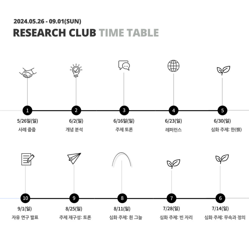 2024년 히스테리안 리서치 클럽은 일제 강점 식민화 및 해방 후 전쟁, 그리고 그에 앞선 시대의 가치들이 지금의 우리를 어떻게 조형하였는지 이해하고자 합니다. 연구서, 문학서, 철학서를 함께 읽고, 한국적 미학의 계보를 역사∙사회적, 철학적, 비판적 관점에서 탐구하는 공동 리서치를 진행합니다.