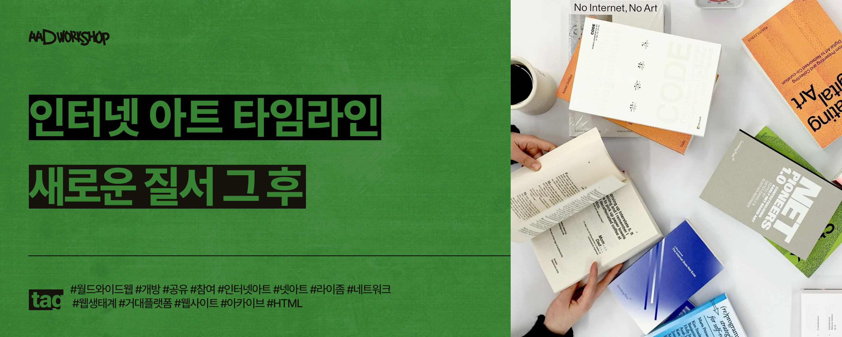 이 워크숍에서는 디지털 아트를 위한 온라인 아카이브 ‘라이좀(Rhizome)’이 2019년에 출판한 『넷 아트 앤솔로지』(anthology.rhizome.org)를 바탕으로, 인터넷 아트 작품 100점을 살펴봅니다. 작품은 1990년대 웹의 등장으로 시작한 네트워크 문화에서부터 2000년대 이후 등장한 포스트 인터넷 아트에 이릅니다.