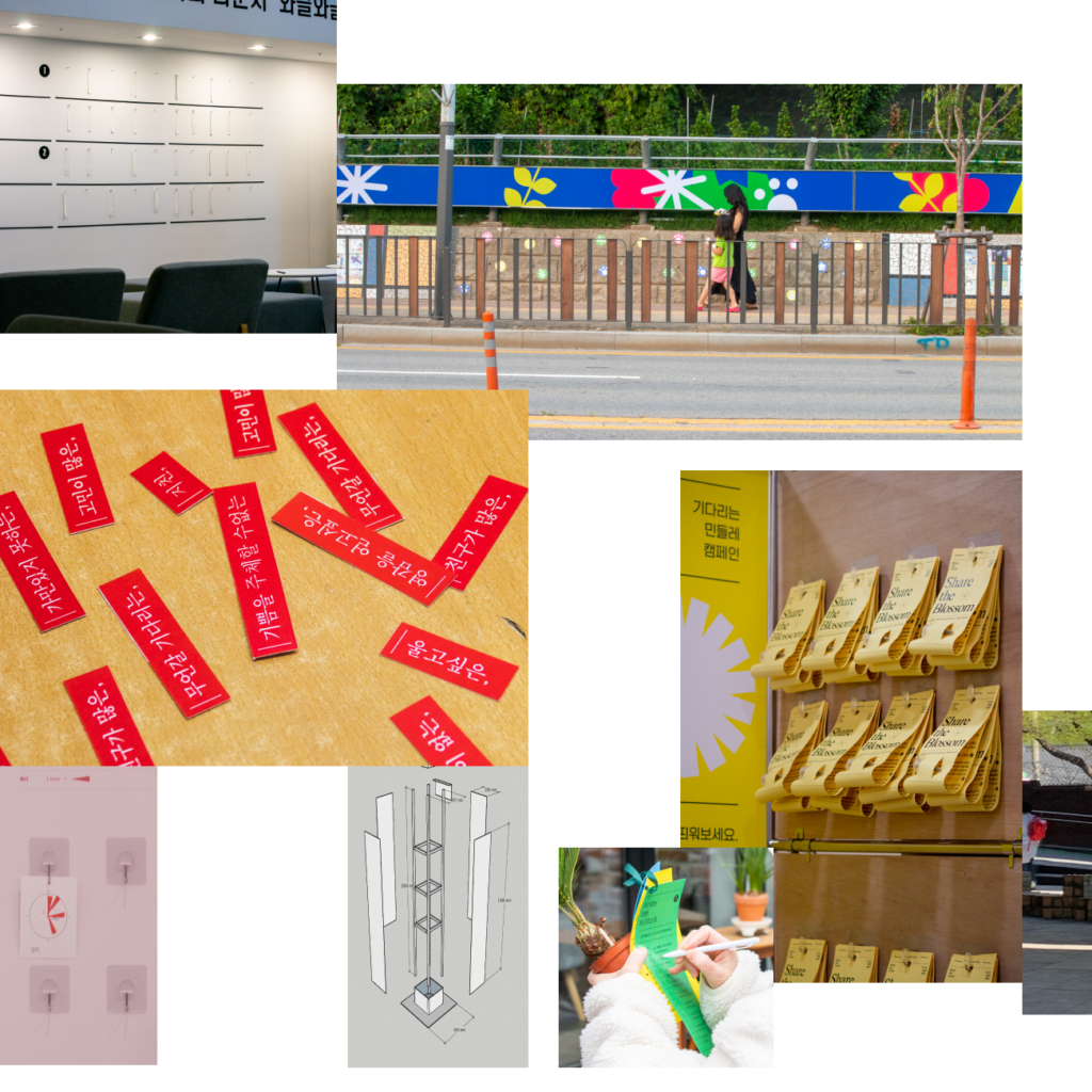 공공캠페인, 공공예술, 공공디자인 등 다양한 영역으로 분류되는 동안에 우리는 ‘참여’에 대한 다양한 고민과 회의가 있었다.공공에 전하고 싶은 메시지를 적절한 미디어에 담아내는 운동을 전개하며 만난 시민과 활동에서 여러 분야의 참가자와  ‘시민참여’, ‘사회적 개입방식’에 대해 이야기를 나누고자 한다.